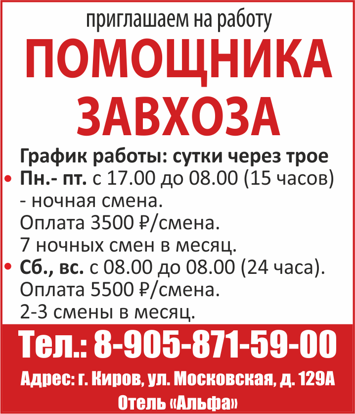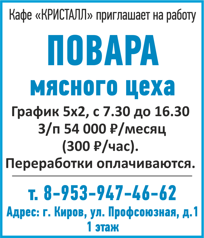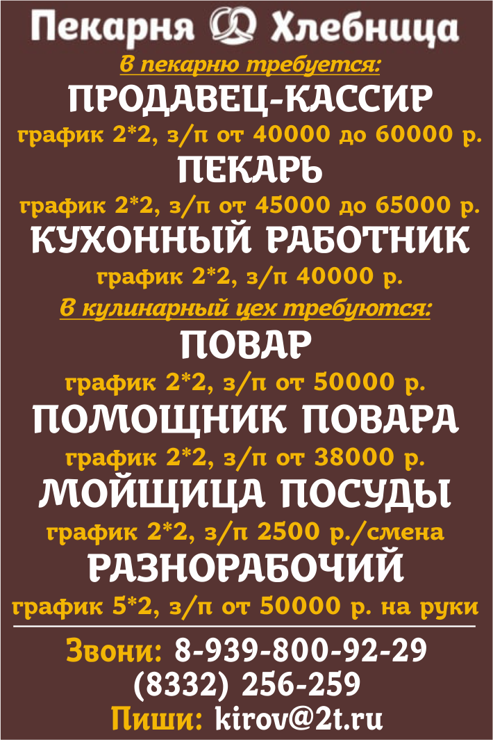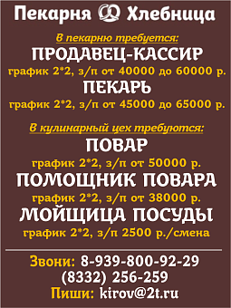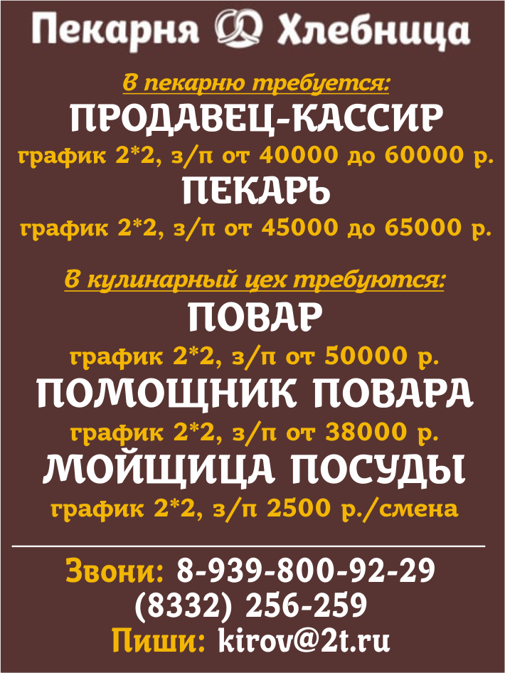 На сайте нашей газеты собраны лучшие предложения о работе как для работодателей, так и для соискателей. Частое обновление не позволит пропустить актуальные и свежие объявления о вакансиях в Кирове и области. Для удобства наших посетителей создана специальная база данных, в которой пользователь сможет найти подходящую именно ему вакансию по многим критериям, не посещая центра занятости. Для работодателей существует возможность разместить свои объявления и быстро подобрать хорошие и квалифицированные кадры в городе и области. Кроме того, на сайте размещены интересные статьи о работе. Здесь можно найти полезные советы по интересующим вас темам: как вести себя на собеседовании при приеме на работу или как добиться повышения в должности и зарплате. Работодателям также будут интересны данные публикации, так как мы предоставляем возможность размещать статьи о своей фирме или предприятии.