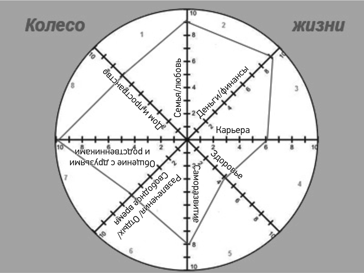 В оценке ориентируемся только на собственные ощущения. Задаём себе вопрос: "На сколько я доволен этой сферой в своей жизни?". И ставите точку на каждой спице, которая соответствует вашим баллам.