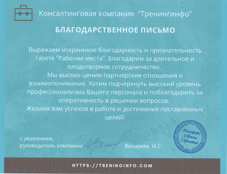 Наша компания является постоянным клиентом газеты «Рабочие места», размещаемся еженедельно по понедельникам. Основным фактором выбора вашего издания стало количество откликов от соискателей. И это фактические данные, так как чуть ранее проводился мониторинг, на основании которого сделан вывод: издание «Рабочие места» – это эффективный помощник в поиске персонала, так что продолжаем с вами тесно сотрудничать.