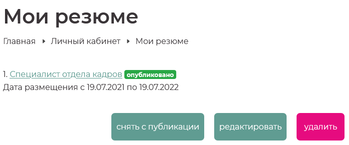 Резюме появится на сайте сразу же после размещения.